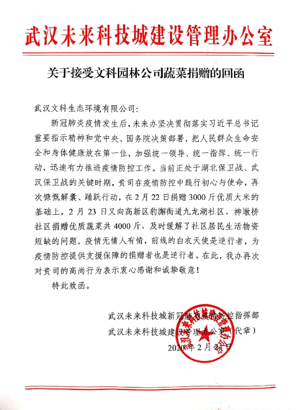 为支持政府打赢新冠肺炎疫情攻坚战,,, , ,,,武汉公海555000jc线路检测中心官网生态踊跃行动,,, , ,,,向武汉未来科技城新冠肺炎防控指挥部,,, , ,,,分批捐赠了园区自产的3000斤生态有机大米和4000斤有机蔬菜等物资,,, , ,,,实时缓解了社区住民生涯物资紧缺的问题。。。。。
