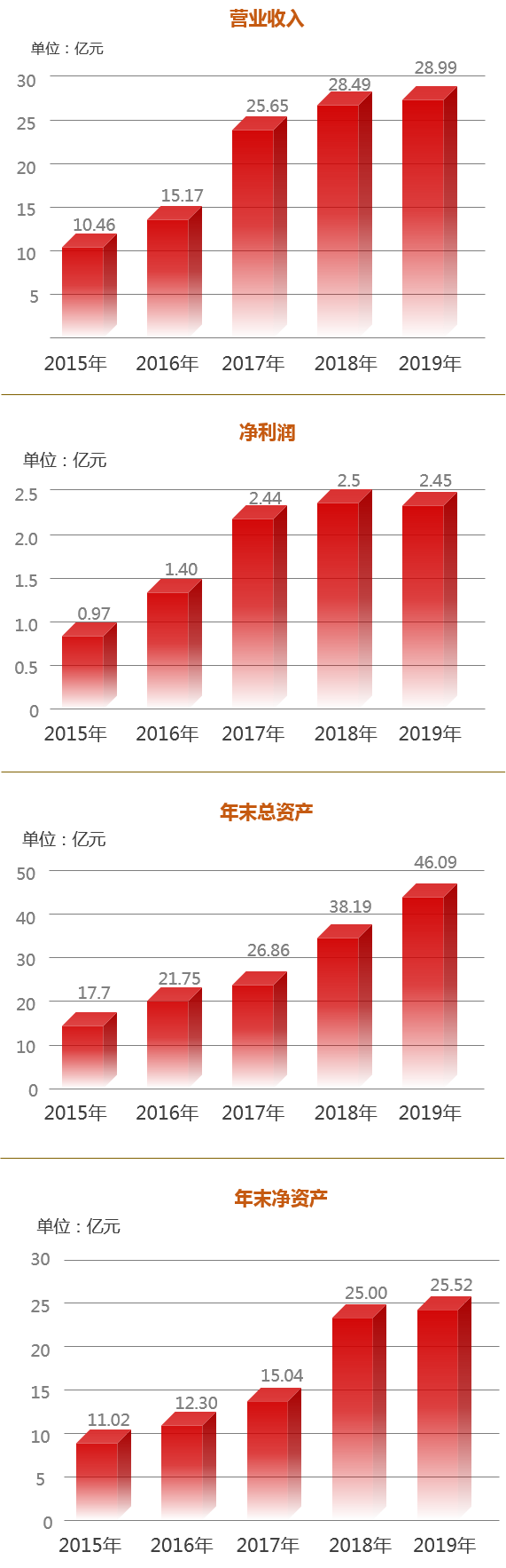 ÉÏÊÐÒÔÀ´£¬£¬£¬£¬£¬£¬£¬£¬¹«Ë¾×½×¡Éú³¤»úÔµ£¬£¬£¬£¬£¬£¬£¬£¬ÊµÏÖÁËÒµ¼¨µÄÎȲ½ÔöÌí¡£¡£¡£¡£¡£¹«Ë¾ÓªÒµÊÕÈë´Ó2015ÄêµÄ10.46ÒÚÔª£¬£¬£¬£¬£¬£¬£¬£¬µ½2019ÄêµÄ28.99ÒÚÔª£¬£¬£¬£¬£¬£¬£¬£¬Äê¾ùÔöÌíÂÊ´ï29.03%£»£»£»£»£»¾»ÀûÈó´Ó2015ÄêµÄ9692ÍòÔª£¬£¬£¬£¬£¬£¬£¬£¬µ½2019ÄêµÄ2.45ÒÚÔª£¬£¬£¬£¬£¬£¬£¬£¬Äê¾ùÔöÌíÂÊ´ï26.09%£»£»£»£»£»¹«Ë¾×Ü×ʲú¹æÄ£´Ó2015ÄêµÄ17.7ÒÚÔª£¬£¬£¬£¬£¬£¬£¬£¬µ½2019ÄêµÄ46.09ÒÚÔª£¬£¬£¬£¬£¬£¬£¬£¬Äê¾ùÔöÌíÂÊ´ï27.03%£»£»£»£»£»¹«Ë¾¾»×ʲú¹æÄ£´Ó2015ÄêµÄ11.02ÒÚÔª£¬£¬£¬£¬£¬£¬£¬£¬µ½2019ÄêµÄ25.52ÒÚÔª£¬£¬£¬£¬£¬£¬£¬£¬Äê¾ùÔöÌíÂÊΪ23.36%¡£¡£¡£¡£¡£ÔÚºê¹Û¾¼ÃÇéÐεÍÃÔ¼°ÐÐÒµÕûÌåÉú³¤µ¹Ô˵ÄÇéÐÎÏ£¬£¬£¬£¬£¬£¬£¬£¬¹«Ë¾ÓÐÓùæ±ÜΣº¦£¬£¬£¬£¬£¬£¬£¬£¬ÊµÏÖÁËÎȹÌÉú³¤£¬£¬£¬£¬£¬£¬£¬£¬»ñµÃ×ÊÔ´Êг¡Ò»¶¨¡£¡£¡£¡£¡£
